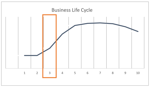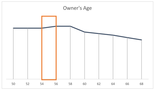 Looking at the graphs below, when do you think it would be best for this particular owner to sell his or her business? If you guessed when the owner is 54 to 56, you are correct! The business is growing, the external markets are good and the owner is still energetic and enthusiastic.